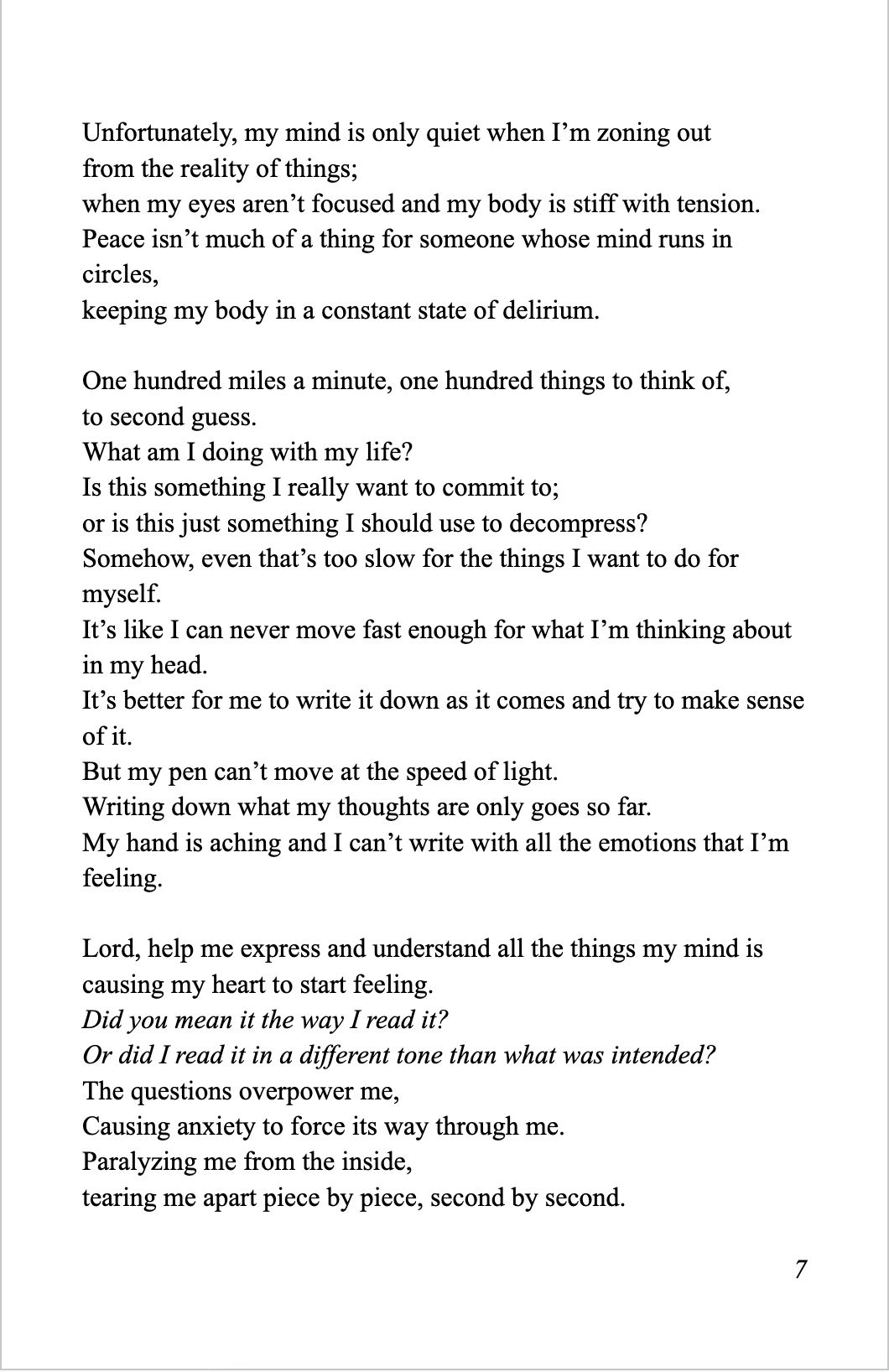 This poetry book is a love letter to the soul. Whispers Between the Pages is a collection of poems rooted in faith, healing, identity, love, and becoming. These pages hold soft truths and sacred questions—written for the quiet-hearted, the deeply feeling, the ones learning to speak up again.